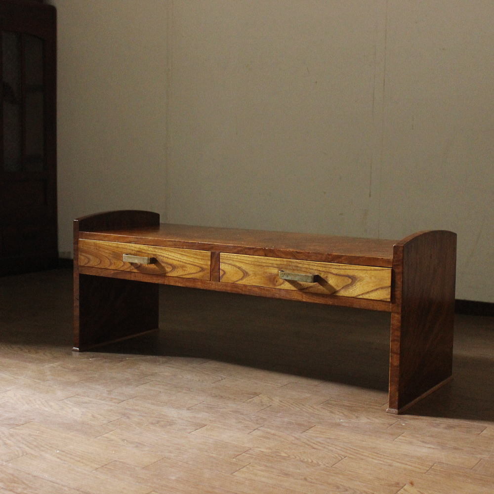 ■商品名■ 昭和レトロアンティーク家具、古い座机 ■状態■ 古い文机です。 使い込まれた質感がいい感じで、レトロな味わい深い一品です。 主要材に杢模様の綺麗な欅材、引き出しの底は合板です。 引出ししが2杯ついおりちょっとした収納に重宝。 ちょっとした飾り台などにも丁度良い高さをしており、 落ち着いたお部屋や書斎などの和の雰囲気作りにいかがでしょうか。 ■サイズ■ 幅92.5×奥行34×高さ36.5 ※送料につきましては、着払いとなりますのでご注意ください。